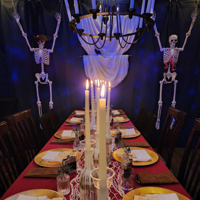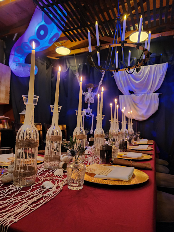 This Halloween dinner set sail on a high-seas adventure, transforming the space into a candlelit pirate ship filled with weathered wood, lantern light, and seafaring intrigue. Guests arrived in pirate attire and received customized flasks as part of their character roles in a murder mystery set aboard the cursed vessel. Between bites of hearty fare and sips of spiced cocktails, they uncovered secrets, accused scallywags, and navigated twists in the tale. With immersive décor, interactive storytelling, and a touch of treachery, the night was a swashbuckling celebration to remember.
